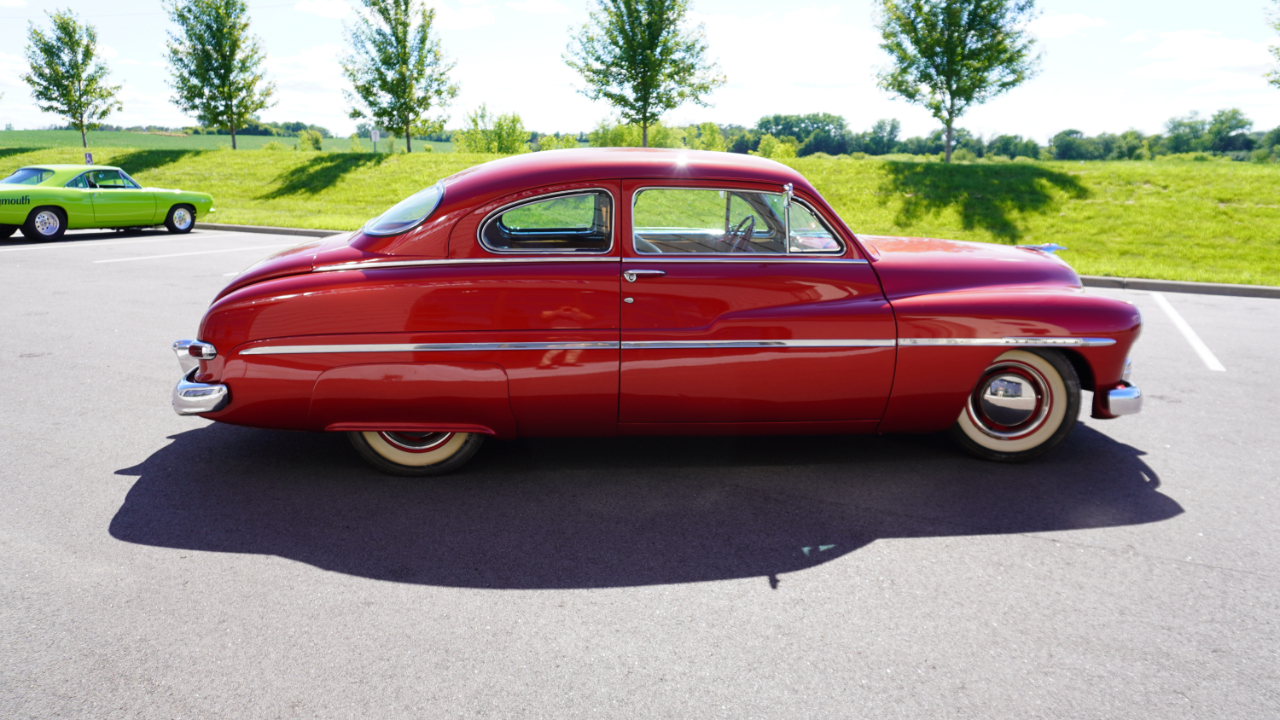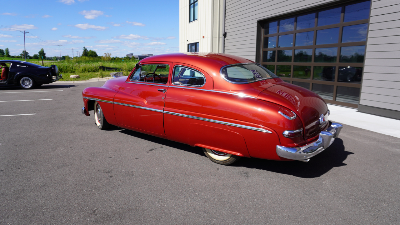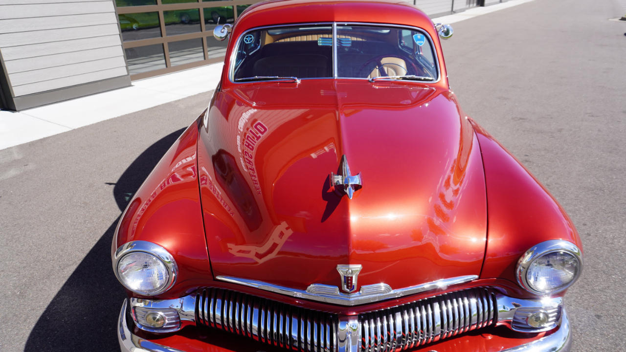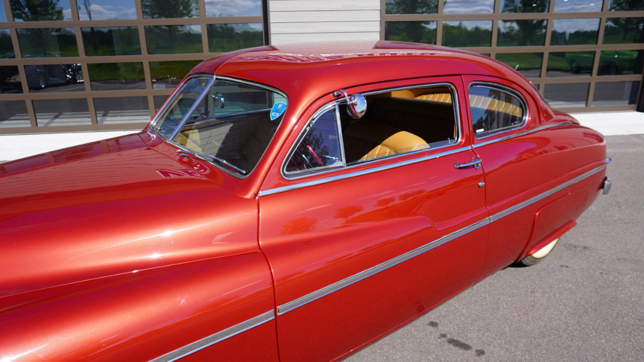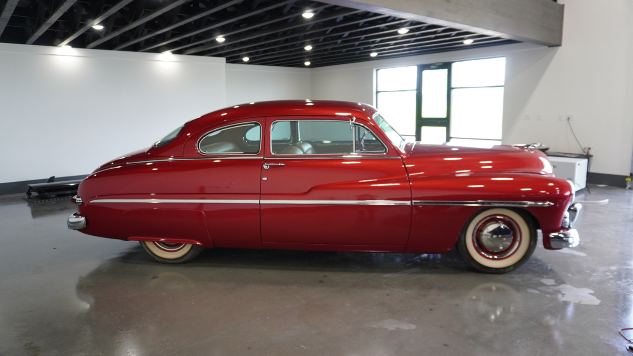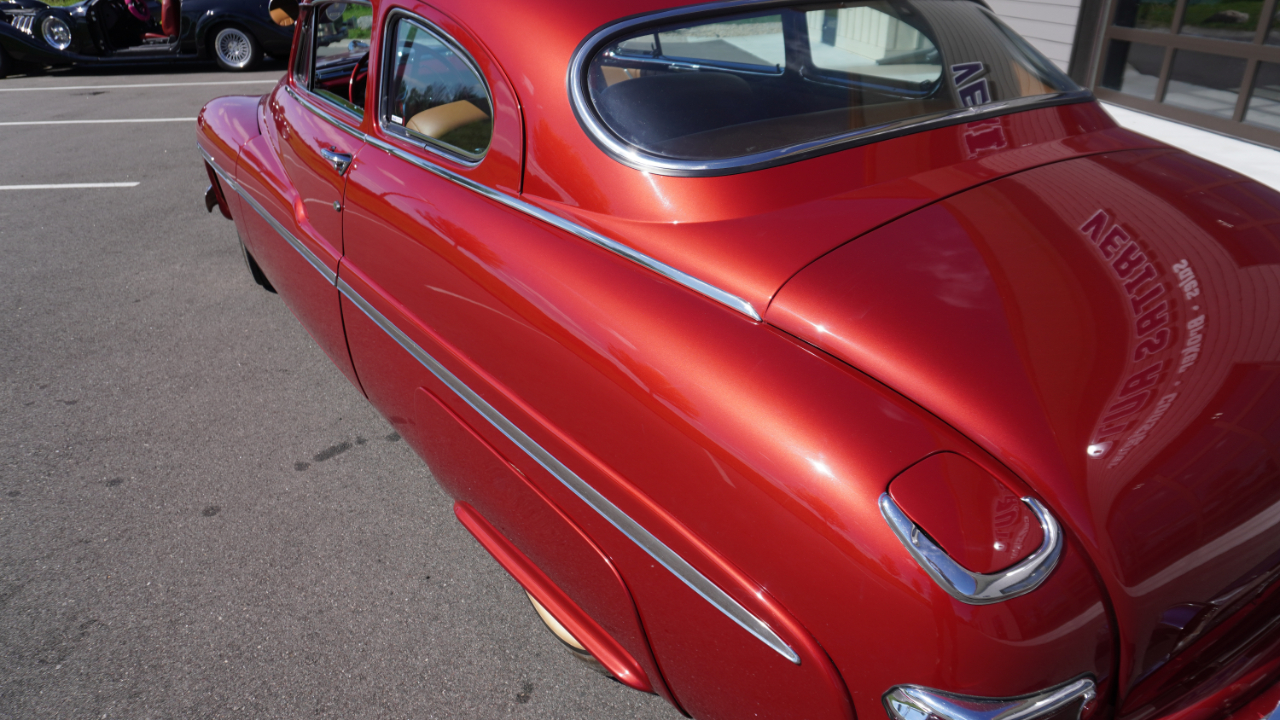 Beautiful 1950 Mercury Coupe with a deep custom red paint job. Notice how the color shifts in the sun and the paint sample is on hand for future touch ups or paint needs.