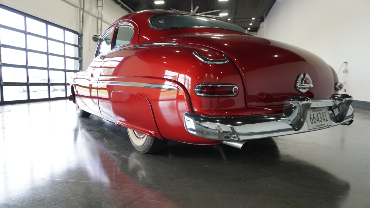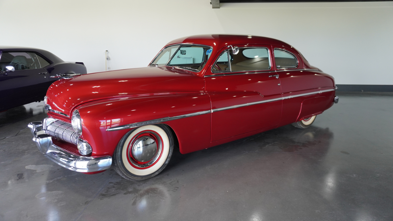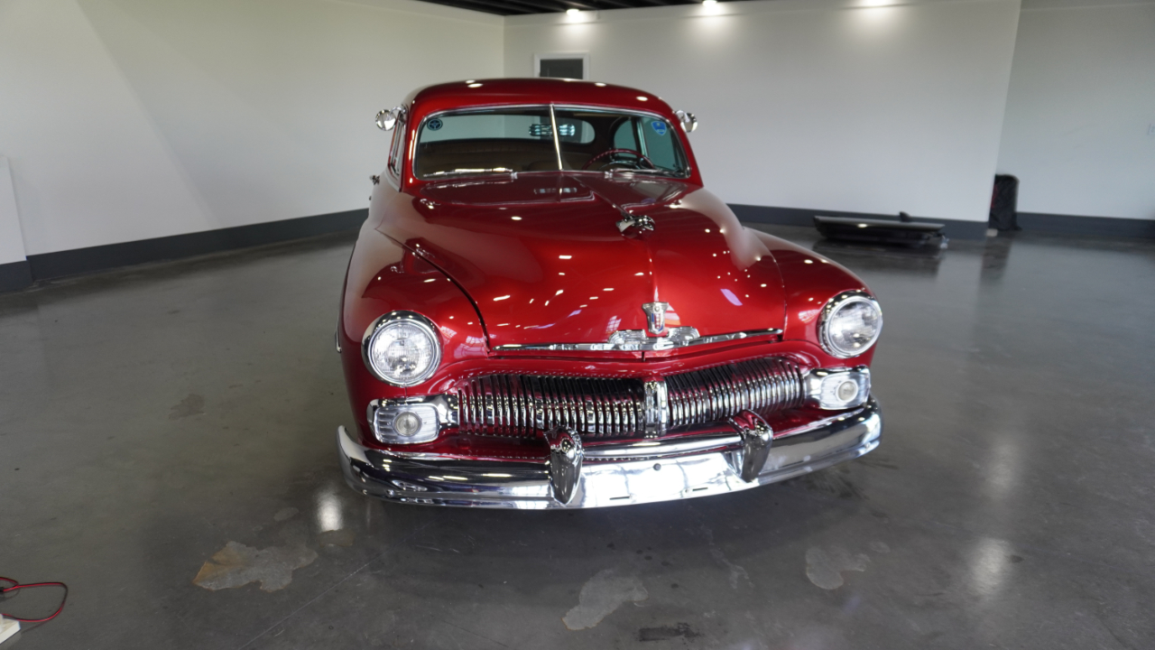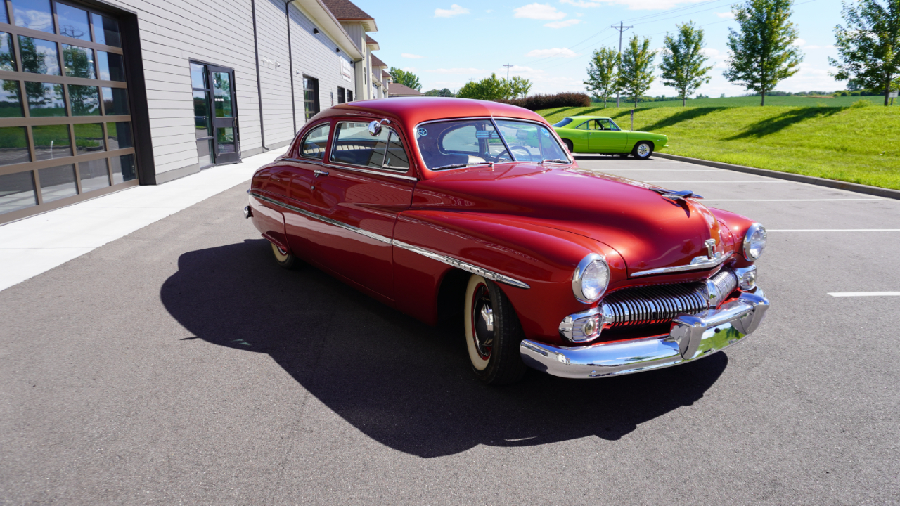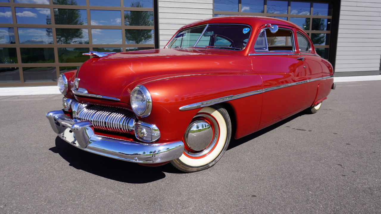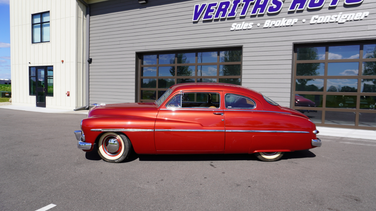 Beautiful 1950 Mercury Coupe with a deep custom red paint job. Notice how the color shifts in the sun and the paint sample is on hand for future touch ups or paint needs.