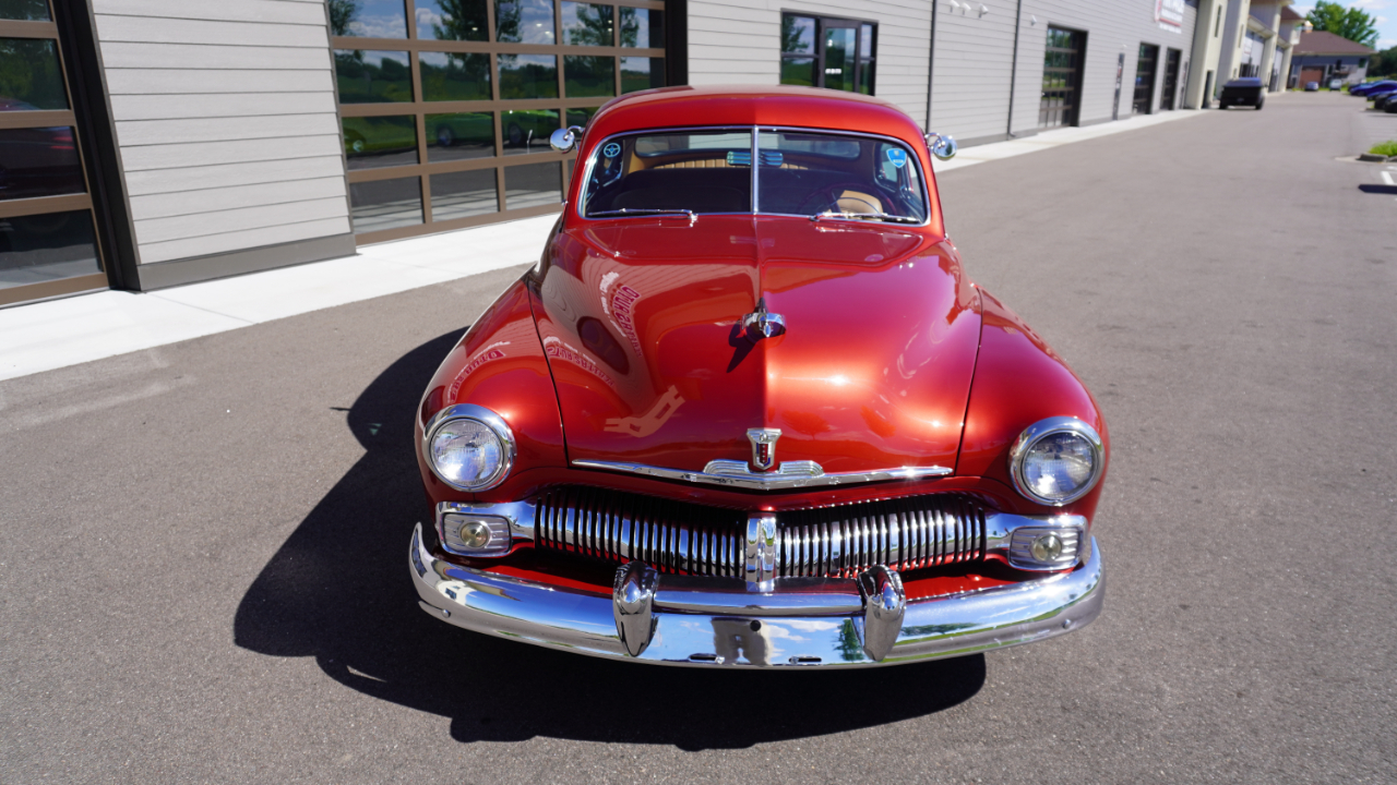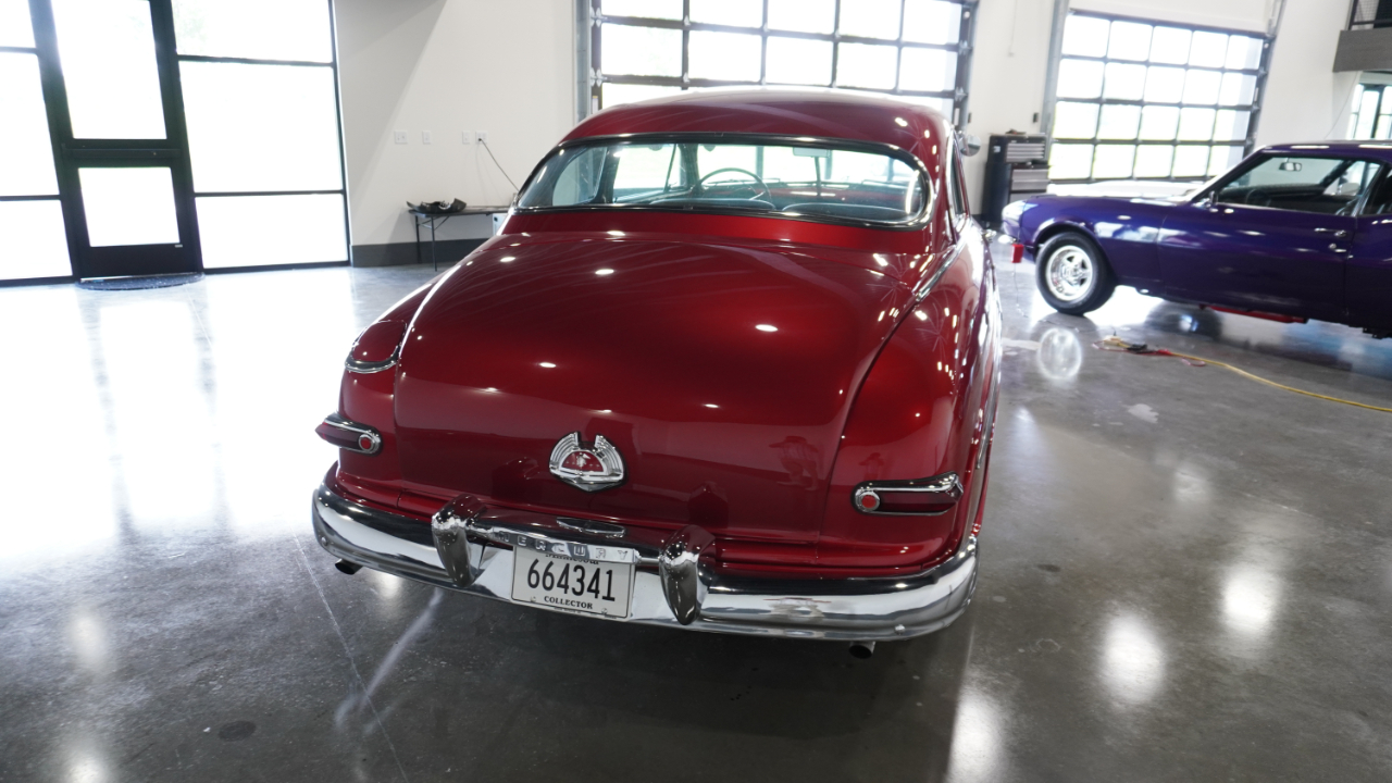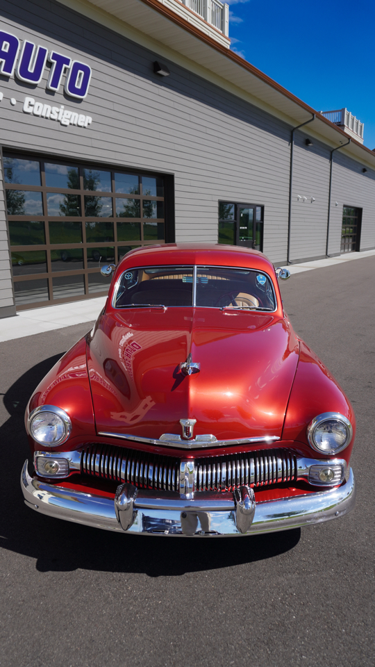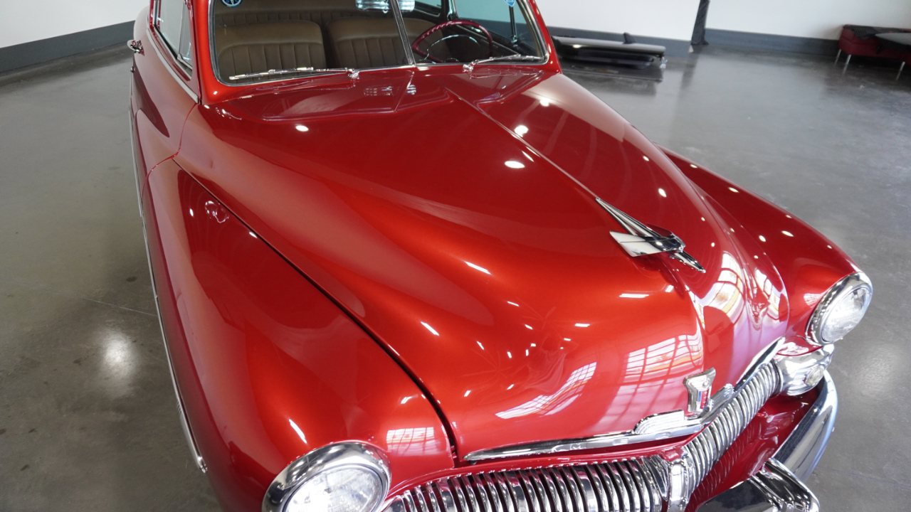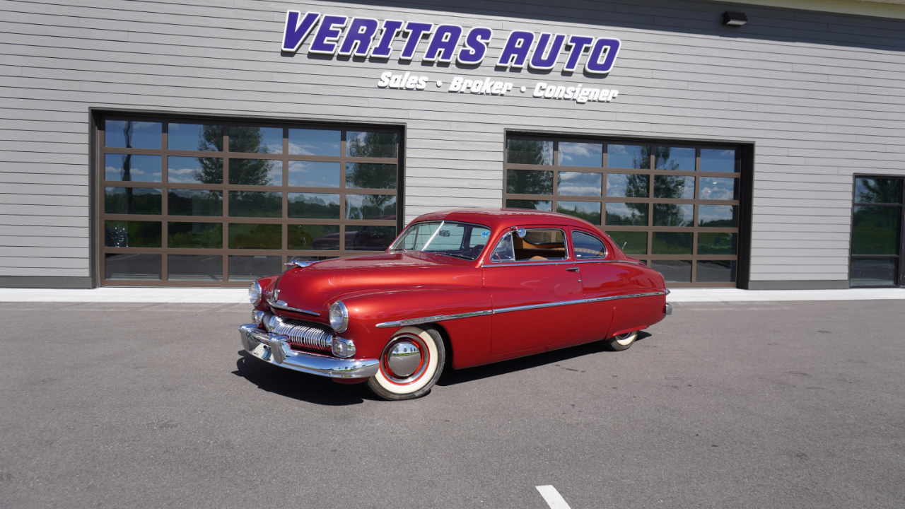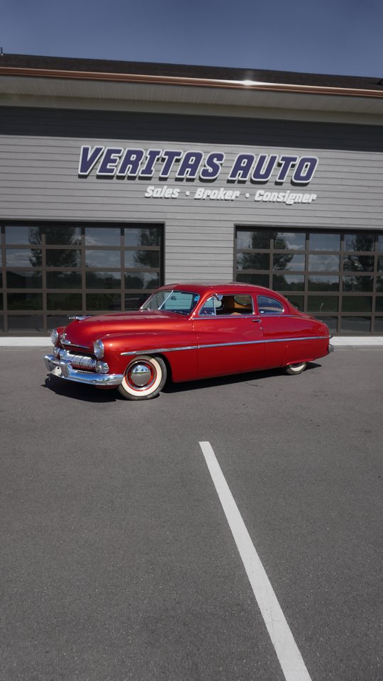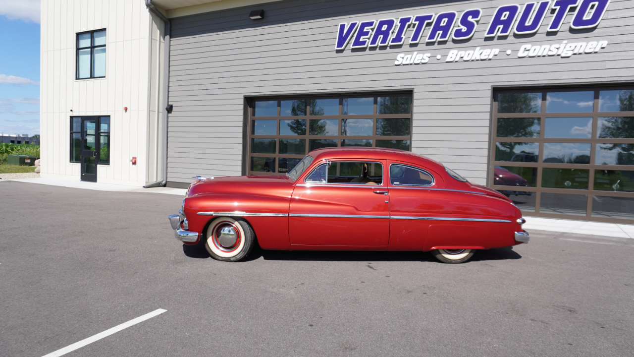 Beautiful 1950 Mercury Coupe with a deep custom red paint job. Notice how the color shifts in the sun and the paint sample is on hand for future touch ups or paint needs.