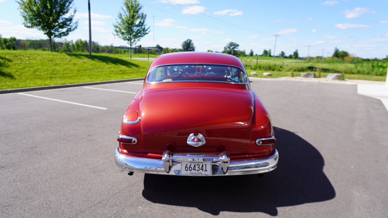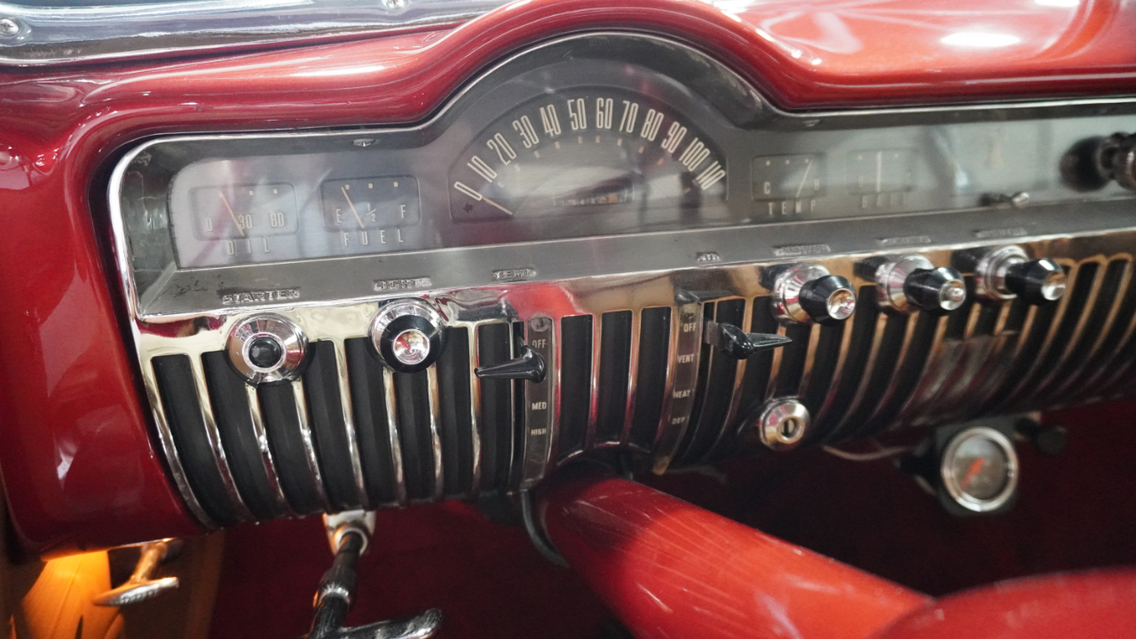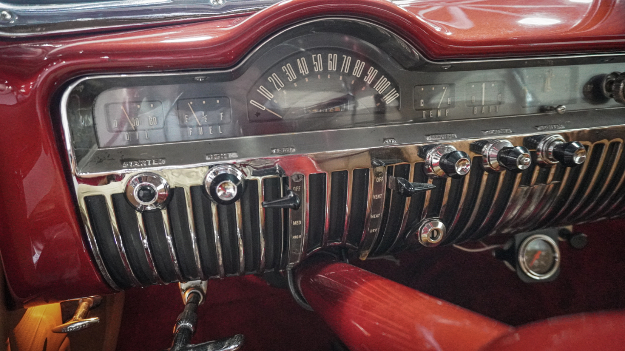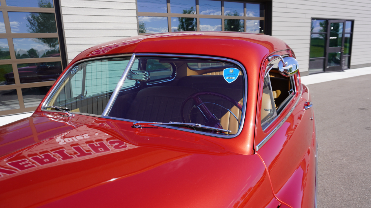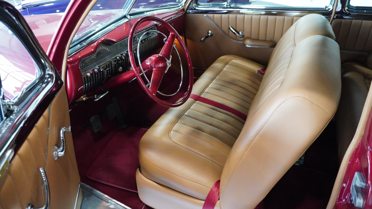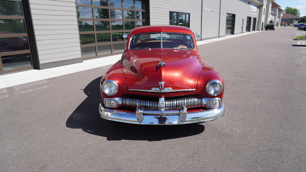 Beautiful 1950 Mercury Coupe with a deep custom red paint job. Notice how the color shifts in the sun and the paint sample is on hand for future touch ups or paint needs.